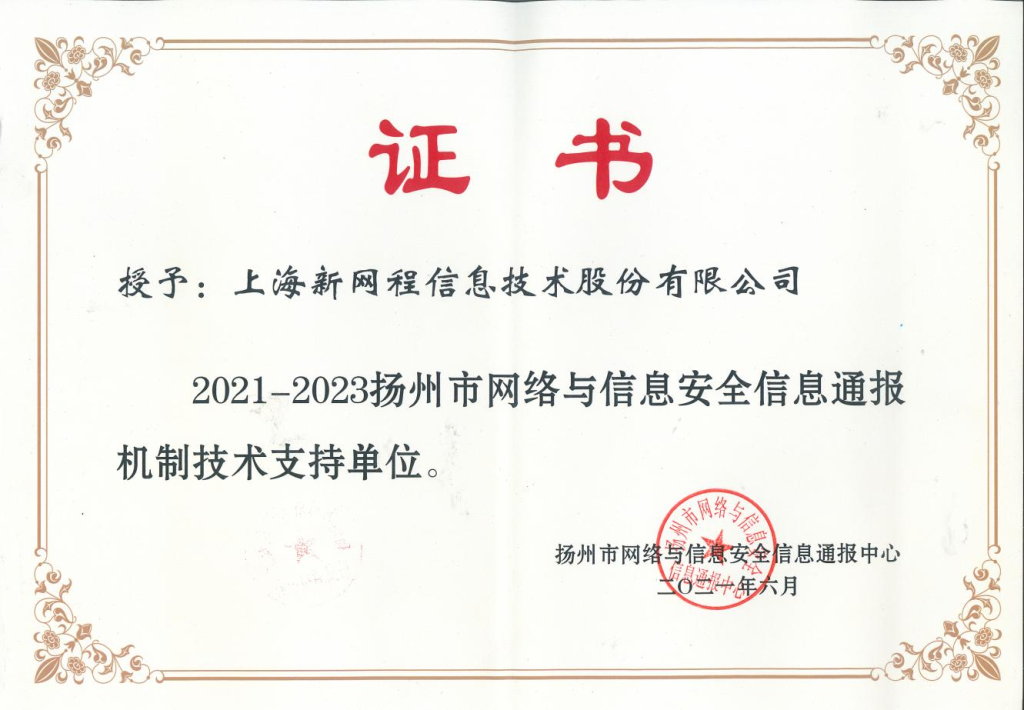 2021年5月,在扬州市网络与信息安全信息通报中心公开征选的第一届网络安全技术支持单位中, 经资格审查、综合评审等环节,上海新网程信息技术股份有限公司顺利成为“2021-2023扬州市网络与信息安全信息通报机制”技术支持单位,并获得资格证书。